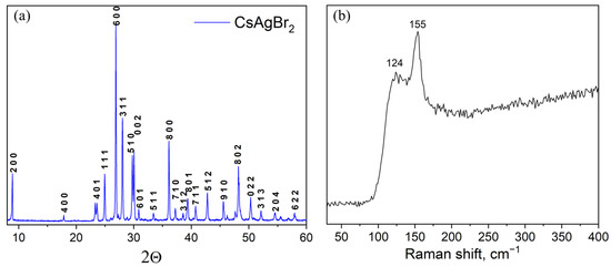 Samples of the CsAgBr2 binary bromide (point ‘2’) obtained at a temperature of 260 °C and an annealing time of 96 h were also single-phase, according to the corresponding XRD data (Figure 6a). The typical Raman spectrum of caesium dibromoargenate(I) CsAgBr2 is given in Figure 6b. The spectrum includes two maxima, namely, the strongest one at 155 cm−1 and less intensive at 124 cm−1 that, most likely, correspond to vibrational models ν1 and δ of [AgBr4]3− vibrations [41].