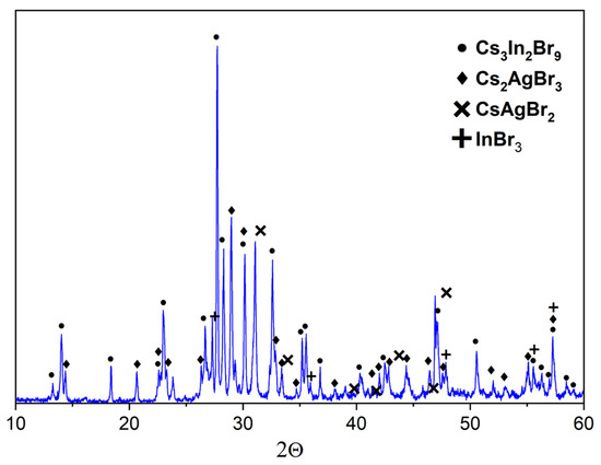 The diffraction pattern for the theoretical composition Cs2AgInBr6 (•—Cs3In2Br9 [Springer materials ID: sd_1712349]; ♦—Cs2InBr5 [37]; +—Cs2AgBr3 [PDF #01-072-9840]; ▼—AgBr (PDF-2 #79-149).