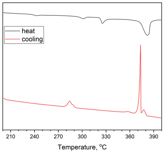 The cooling curve differs from the heating process. At higher temperatures, there is a smaller maximum at 380 °C (653 K) and the following narrower and sharper maximum at 372 °C (645 K). Most likely, such exothermic effects correspond to crystallization of Cs3In2Br9 phase and crystallization of indium(III) bromide (420 °C, 693 K). Then, there is a very weak maximum at 356 °C (629 K).