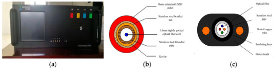 Optical fiber temperature measurement system; (a) DTS demolition instrument; (b) Armored temperature measuring optical cable; (c) Heating armored temperature measuring optical cable.