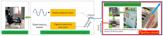 Ground heating tests were performed to test the applicability of the heating pipeline and the stability of the heating system and check whether the heating system could run stably. The time required for heating to the constant temperature, pipe sealing performance, the sensitivity of DTS instruments, and the stability of the fiber temperature measurement system were determined. In this study, a loop was formed on the ground. The total length of the pipeline was 120 m. The cable extended 40 m from the outlet of the electromagnetic heating furnace. The installation of on-site temperature-measuring optical cables and data collection instruments is shown in Figure 4. Temperature-measuring cables could be laid around the heating pipe to detect the abnormal temperature in the extension direction of the heating pipe after the ground heating system was laid and to test the detection effect of the temperature-measuring cable and DTS system.