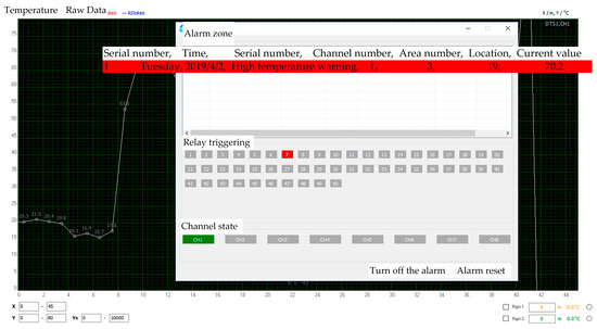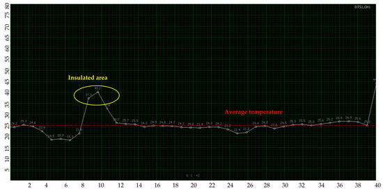 The high-temperature alarm in this section was canceled, the insulation foam and continuous heating were removed, the heating temperature was adjusted to 75 °C, and the high-temperature alarm temperature was set to 70 °C. As shown in Figure 9, the alarm value was first reached at a place 19 m away from the DTS interface after approximately 30 min of heating. The temperature at this point was 70.2 °C.