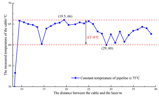 The 70 °C alarm value was canceled, and the heating furnace entered the 75 °C heat preservation mode. At this time, the temperature of the pipeline was stable at approximately 65 °C, as detected by the optical cable. Moreover, the maximum temperature difference between different detection points was 6 °C. These findings indicated that the optical cable could obviously detect the abnormal leakage and that the temperature difference between the leakage area and the environment needed to be greater than 6 °C. The measured temperature image is shown in Figure 10.