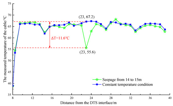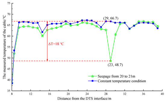 Figure 13 shows that after continuous watering at a distance of 22–23 m from the DTS joint (the first 8 m of the optical cable was not laid on the heating pipe), the maximum temperature dropped approximately 11.6 °C within the range of 22–24 m. Moreover, the minimum temperature was 55.6 °C, which occurred at 23 m. Figure 14 shows that after stopping the watering and waiting for the temperature to stabilize, the maximum temperature dropped by approximately 18 °C within 28–30 m after continuous watering at a distance of 28–29 m from the DTS joint. The minimum temperature was 48.7 °C, appearing at the position of 29 m.
