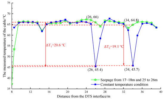 The temperature dropped after watering at 25–26 m and 28–29 m away from the DTS joint are shown in Figure 15. In the range of 25–27 m, the maximum temperature dropped to 18.2 °C, and the minimum temperature was 47.8 °C, which appeared at the position of 26 m. In the range of 28–30 m, the maximum temperature dropped to 18.8 °C, and the minimum temperature was 47.9 °C, which occurred at the position of 29 m. Watering was stopped, and the temperature on the optical cable line returned to stability. Figure 16 shows that in the range of 25–27 m, the maximum temperature dropped to 20.6 °C, and the minimum temperature was 45.4 °C after watering at 25–26 m and 33–34 m away from the DTS joint, which appeared at the position of 26 m. In the range of 33–35 m, the maximum temperature dropped to 19.1 °C, and the minimum temperature was 45.7 °C, which occurred at the position of 34 m. In general, the artificial cooling area and the abnormal temperature area measured by the optical cable had good correspondence. The error was within 1 m, and the abnormal temperature difference anomaly ΔT was approximately 18 °C, which was obviously greater than the maximum temperature difference of the line itself ΔT. The detection effect was noticeable.