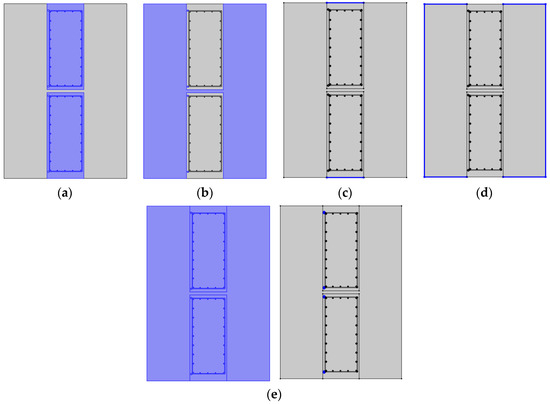 The heat transfer interface; (a) Wall heat transfer; (b) Soil heat transfer; (c) Insulating thermal field; (d) Open thermal field; (e) Initial temperature field.