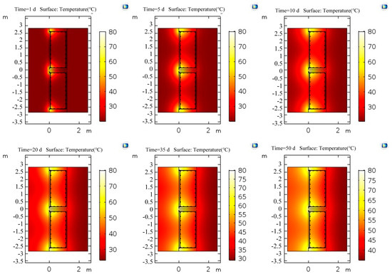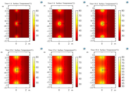 The conjugate heat transfer interface was used to calculate the temperature field distribution of the above two models. The temperature inside the wall increased accordingly after the heating system outside the wall continued heating for a time. When the temperature difference between the location where the optical cable was laid in the wall and the ambient temperature was large (>ΔT = 6 °C), the confined water outside the wall would continue to flow into the pit if purdah leakage occurred during dewatering. Apparent low-temperature anomalies at the leakage location could be observed. Therefore, the boundary of the soil in the laminar flow interface was set as an open boundary; that is, the water in the soil was in a free-flowing state, the ambient temperature was set to 20 °C, the temperature of the heating pipe was set to 80 °C, and the heat transfer temperature for 0–50 days was studied. The temperature field variations with time are shown in Figure 22 and Figure 23.