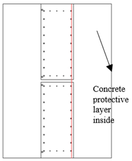 Active temperature field leakage detection was the method of heating the layers and groundwater around the joint of the earth-facing surface of diaphragm walls through artificial heating. During the process, the water temperature around the joint outside the wall was high. Before the excavation of the foundation pit, the soil outside the wall was quickly heated when the foundation pit was not dewatered. The inside of the wall would not be substantially heated because of the poor thermal conductivity of the concrete wall of the reinforced concrete. The inside of the wall slowly heated after a period of heating. If the wall joint had defects, the water inside would be connected with the water outside the wall at the joint. At this time, the heated groundwater flowed into the wall joint, and the abnormal temperature rise could be detected in the wall. During the foundation pit excavation, the groundwater level in the foundation pit needed to be lowered. If the seam had a defect, the groundwater outside the wall would flow into the wall. At this time, the temperature-measured optical cable in the wall could detect that the leakage area was slow. The water outside the wall kept flowing into the pit, and the heating efficiency of the heating system outside the wall was limited. Thus, the effect of active temperature field leakage measurement was remarkable in the dewatering process of the foundation pit after the diaphragm wall construction. Manual heating uses the method of circulating hot water on the heating pipeline. The steel pipe was fixed on the steel bar near the earth-facing surface of the steel cage on both sides of the underground diaphragm wall joint. The steel pipe was fixed on the reinforced noodles on both sides near the underground diaphragm wall seams, as shown in Figure 1a.