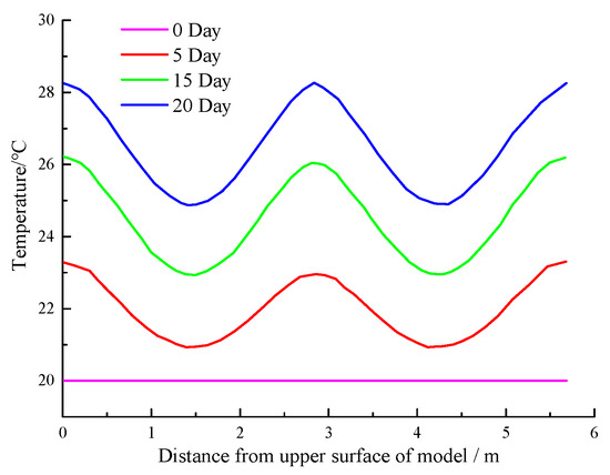 Figure 24 shows that the temperature of the surrounding environment before the detection was 20 °C. As the buried depth increased, the temperature curve varied in a wave shape. The detected temperature increased with the increasing heating time. However, the increase rate decreased gradually. Figure 25 and Figure 26 show that if the heating was continued for approximately 10 days, the temperature of the measuring point inside the wall could increase by 6 °C. At this time, abnormal leakage of the curtain could be detected. The temperature of the measuring point reached approximately 30 °C after heating for 20 days. At this time, the lowest temperature in the concrete protective layer was nearly 27 °C, and abnormal temperatures could be measured at all positions.