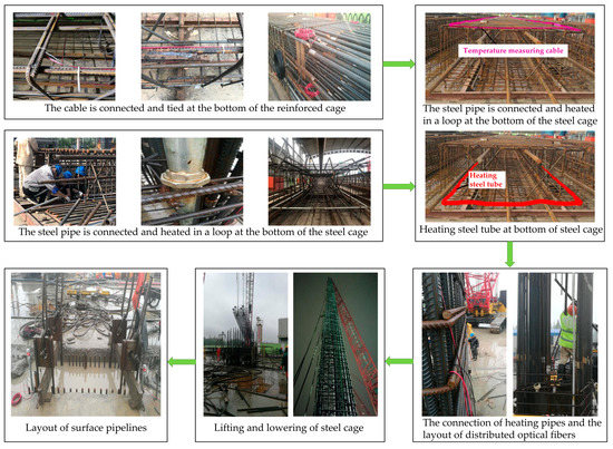 The layout procedure of the heating pipe and temperature measuring optical fiber is shown in Figure 27. The heating pipe is arranged on the earth-facing surface. Since the heating pipe needs to form a loop, it is also necessary to connect the loop at the bottom of the first steel cage. The two steel pipes were fixed with a live joint, and the U-shaped steel bar was used to clamp the movable joint and weld it on the main reinforcement of the steel cage to fix the heating pipe. Temperature-measuring optical cables were arranged on the earth-facing surface and pit-facing surface. The cable is bound to the main bar of the steel cage with a cable tie. A sufficient length of optical cable was reserved on the top of the steel cage to ensure that it can be exposed to the ground, and the excess optical cable was coiled on the top of the steel cage.