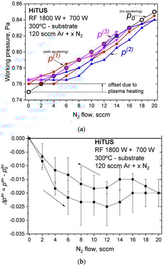 Decoupling of the target from plasma discharge in HiTUS causes the voltage and current at the remote plasma source not to be influenced by reactive gas. The only easily detectable indication of the reactive processes would be the pressure changes [32]. Figure 1a shows the evolution of the total working pressure p0 (open circles) in the chamber with the plasma generated by the remote plasma source but without sputtering (RF power on the target was off). The pressure p0 measured by baratron changed linearly with the increase and/or decrease of nitrogen flow, and no differences were observed during the whole cycle. The small full symbols correspond to working pressure p during three cycles of nitrogen flow increase and decrease after RF 700 W was applied to the target and sputtering occurred. Immediately after the onset of sputtering at 0 sccm N2, p was systematically increased from 0.75 to 0.765 Pa. Such an increase cannot be related to reactive sputtering because of the absence of nitrogen. It was therefore attributed to plasma heating after the application (addition of energy) of sputtering and subsequent Ar expansion. Thus, the p increase at 0 sccm N2 was considered an artifact and was subtracted from the experimental values for further consideration. Three independent cycles of p measurements in Figure 1a slightly deviated from each other. To reduce the influence of the measurement errors, these three measurements were averaged, and only the average pav = [p(1) + p(2) + p(3)]/3 values were used. Figure 1b shows the curves of the average pressure difference ∆pav = pav − p0 during the nitrogen flow increase/decrease cycle. The physical meaning of ∆pav is related to the amount of reactive gas consumed by the reaction with the sputtered material leading to nitride formation [46]. Figure 1b shows ∆pav dependence after the elimination of the temperature artifact. Despite the relatively large scatter, all corrected ∆pav values were negative. The curve connecting average points during an increase in N2 flow decreased up to around 8 sccm N2, implying full nitrogen consumption. In the 8–12 sccm nitrogen flow range, ∆pav and nitrogen consumption remained approximately constant. At flows > 12 sccm, it increased and then stabilized at values slightly higher than the minimum. When the nitrogen flow decreased in the second part of the cycle, a very similar curve simply shifted upward by about 0.015 Pa. This shift was barely larger than the accuracy of the measurement. The hysteresis behavior, in this case, would therefore be very small and close to the error of measurement.