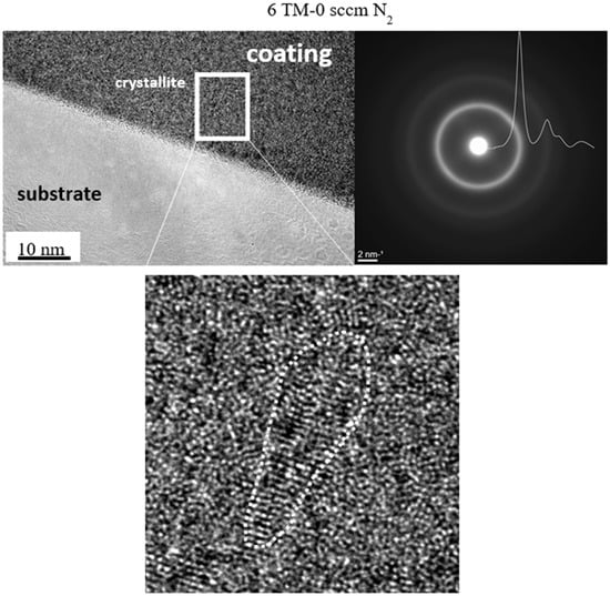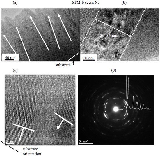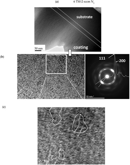 TEM observations in the coating deposited with 2 sccm N2 showed a crystalline-like structure consisting of columnar grains growing perpendicularly to the substrate surface (Figure 5a). Their diameters were in the 10 nm range, and they were embedded in a residual amorphous phase. At higher magnifications, the columns were found to consist of many nanocrystallite domains with distinct preferred orientations and oriented mainly perpendicular to the substrate surface (Figure 5b). Very intense SAED reflections confirmed the presence of preferred orientation in a just-forming fcc structure. The spots’ broadening of ~18° in an angular direction was attributed to misorientation from preferred directions. The diffraction spots in the first circle correspond to 111 reflections. Next to them, a second ring of weaker 200 reflections can be observed. The existence of both 111 and 200 is strongly supported by the right shoulder in the most intense first peak of the azimuthal integral of the SAED pattern. The two strongest spots, overlapping 111 and 200, are oriented in a direction perpendicular to the substrate surface.