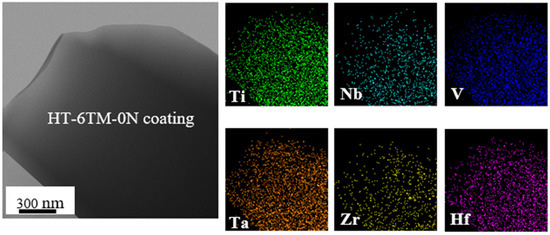 EDS mapping of the distribution of transition metal elements in the studied HiTUS–TiNbVTaZrHf-0N coating (~1705 nm thick).