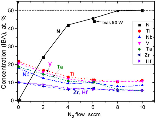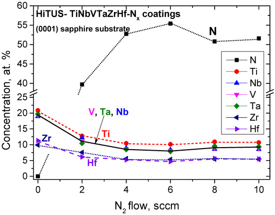 Average semi-quantitative EDS compositions of the studied reactive HiTUS TiNbVTaZrHf-xN coatings (x–flow of nitrogen in sccm) as a function of nitrogen additions in the Ar sputtering atmosphere. The averaging was based on top-view measurements in SEM from four large (900 × 680 µm2) areas.
