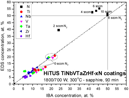 Figure 11 illustrates the differences between EDS and IBA results. The dotted diagonal line corresponds to an ideal overlap of EDS and IBA concentrations. Nitrogen concentrations at 2, 4, and 6 sccm N2 located above this line suggested +16 at%, +10 at%, and +10 at%, respectively, overestimations of nitrogen concentrations by EDS. Very good agreement between both methods was obtained at 8 sccm and 10 sccm. The absolute deviations of TM concentrations from the ideal line were much smaller, usually below 3 at%. They were clearly influenced by the nitrogen concentration error as a result of the normalization of all element concentrations to 100 at%. At the same time, the good accuracy of the measurement of heavy TM elements by EDS was also confirmed by their overlap with the diagonal in the case of metallic alloy coating.