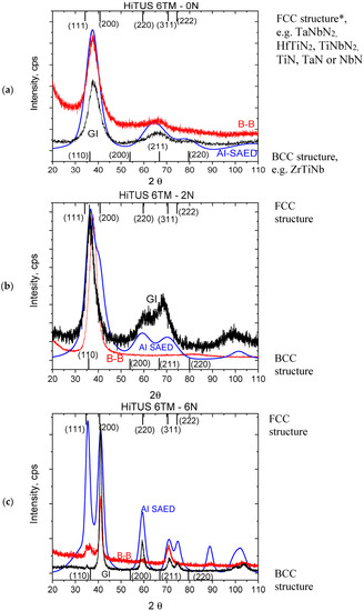 X-ray diffraction patterns of the studied reactive HiTUS TiNbVTaZrHf-xN (HT-6TM-xN) coatings in symmetrical θ/2θ (Brag–Brentano (B-B)), grazing incidence (GI), and azimuthal integral of SAED (AI SAED) from TEM observations and prepared: (a)—without nitrogen addition (0 sccm N2); (b)—with 2 sccm N2 and (c)—6 sccm N2. (*—from [47,48,49,50]).