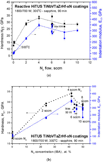The dependences of hardness and indentation modulus in the studied reactive HiTUS TiNbVTaZrHf-xN coatings on (a) nitrogen flow in Ar sputtering atmosphere and (b) IBA nitrogen concentrations.