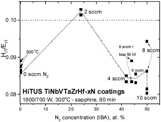 The ratio H/E is often used to estimate the toughness of the coatings, assuming 0.1 as a limit for a transition from brittle to ductile behavior [52,53]. The ratio HIT/EIT calculated from the values in Figure 13 is shown in Figure 14 as a function of nitrogen content. In metallic coating, the ratio was in the range of 0.085 to 0.090, whereas in the nitride coatings, the majority of the values were even below 0.085, especially in the case of excessive nitrogen flows (10 sccm). The only values exceeding 0.1 were obtained in the coating produced with 2 sccm N2. However, it may be an exclusion related to an overestimation of the hardness of this coating (see the deviation from linearity in Figure 13). This assumption was based on the presence of high microstrains and microstresses discussed earlier.