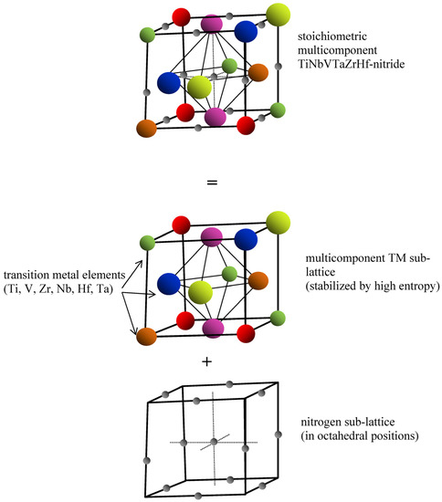 Strong nitride formers among transition metals (TM) including Ti, Zr, Hf, V, Nb, and Ta, form single nitrides with high thermal stability combined with low thermal conductivity, high hardness, and corrosion resistance [1,2]. Additional control and enhancement of these properties via simultaneous alloying by several refractory transition metals were greatly promoted by the introduction of the concept of so-called “high entropy alloys” (HEA) by Cantor et al. [3] and Yeh [4] in 2004. The main idea of HEA is that homogeneous solid solutions with fcc (face-centered cubic), bcc (body-centered cubic), or even hcp (hexagonal close-packed) structures consisting of at least five equimolar metals can be stabilized by configurational entropy. Additional stabilizing “core” effects involve lattice distortion due to variations of atomic radii of different metals, sluggish diffusion resulting from diffusion barriers in such distorted lattice, and the possibility of a synergistic “cocktail” effect [5,6]. The concept of bulk metallic HEA paved the path for the development of high entropy ceramics (HEC) via the introduction of boron, carbon, nitrogen, or oxygen [7,8,9,10,11]. In the case of TM-based nitride ceramics, corresponding transition metals were classified depending on their affinity to nitrogen. Elements with high formation enthalpies from groups (3-) 4–5 groups of the periodic table ((Y) Ti, V, Zr, Nb, Hf, Ta) correspond to strong nitride formers. The metals from 6–10 groups (Cr, Mn, Fe, Co, Ni, Mo, Ru but also Al and Si) with lower formation enthalpies belong to weak nitride formers and even to no-nitride formers (e.g., Cu) [12]. Strong nitride formers easily form interstitial solid solutions in which nitrogen atoms fill voids in the metal sub-lattice, typically with a NaCl-type crystal structure. It involves a mix of covalent, metallic, and ionic bonding resulting in higher mechanical and thermal properties than in single TM-N compounds [7,13]. However, high configurational entropy in the multicomponent nitrides applies only to the metal sub-lattice, whereas the nitrogen sub-lattice is practically not affected. Thus, high entropy ceramics, including nitrides, should be more accurately described as “materials with high entropy metal sub-lattice” [14,15].