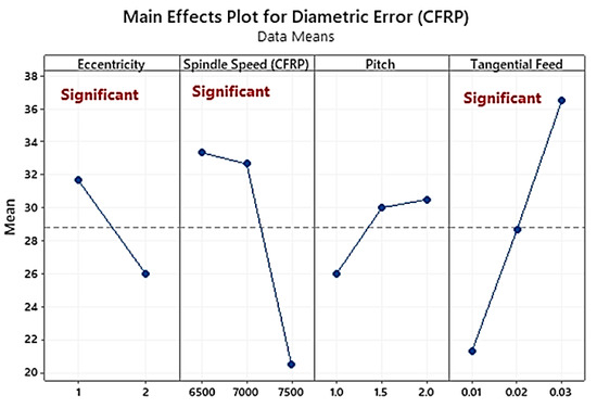 Main effects plot of diametric error in Ti6Al4V hole-making.