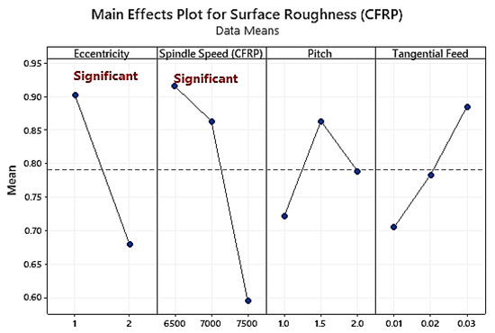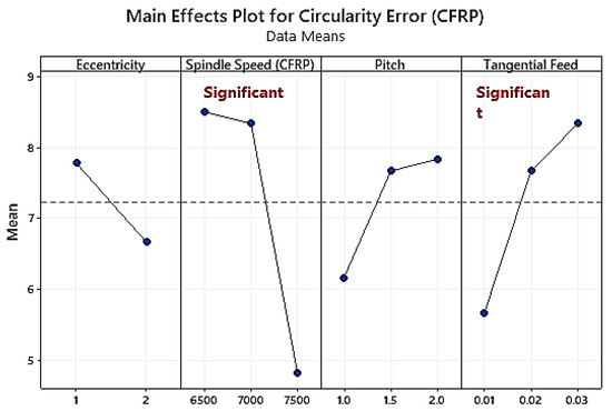 The holes produced in the CFRP layer are oversized. The compact carbon fibres cannot be machined at a lower cutting speed without unfavourable vibrations due to high workpiece and tool vibrations while machining CFRP at the low cutting speed [41]. The effect of eccentricity and tangential feed-in in the Ti layer is the same as in the CFRP layer (Figure 5). However, the error started increasing with the increase in the spindle speed from 6500 rpm to 7500 rpm, due to an unstable machining mechanism at a higher speed. The analysis of variance (Table 4) shows eccentricity (PCR = 28.56%), spindle speed (Ti) (PCR = 42.84%), and tangential feed (PCR = 8.61%) as the most significant parameters.