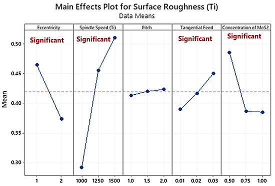 In the analysis of the variance of the Ti layer, the p-value shows that the eccentricity (PCR = 15.31%) and spindle speed (PCR = 58.62%) are highly significant parameters for surface roughness. The second most significant parameters are lubrication mode (PCR = 12.30%) and tangential feed rate (PCR = 4.43%), as shown in Table 8. Roughness values increased from holes 1 to 10 for CFRP and Ti (observed in Figure 9 and Figure 10). Surface roughness for Ti is reduced with an increasing percentage of MoS2 in lubricant. Roughness values conform to the literature for CFRP and Ti and the aerospace standard for roughness criterion [42,45].