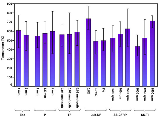 The advantage of the smaller diameter of the cutter in comparison to the milled holes in helical milling is that it allows for the cutting region to have a vent for heat exchange as the region is termed semi-closed. As an inborn characteristic, the process helps in temperature reduction [54]. Therefore, the eccentricity values have a slight variation in the decreasing trend of temperature (Figure 12). In addition to this, the sporadic nature of the helical milling also helps get down the cutting temperature. In the same way, the cutting temperature in the cutting region for conventional drilling stays high. It keeps on increasing as there is no space left for heat depletion. Other critical attributes, such as complications in chip removal, add to the cutting region’s temperature rise [42]. The maximum temperature rise during the experiment is 462 °C, which is for experiment 8 (eccentricity = 1 mm, spindle speed for CFRP and Ti = 7500 rpm and 1250 rpm, respectively, axial pitch = 2.0 mm, tangential feed = 0.02 mm/tooth, concertation of nanoparticles in MQL solution = 0.5%). The results of temperature rise are comparable to the values reported in the literature [55,56], even at low axial pitch in experimental work on helical milling of Ti. Increasing the concentration of nanoparticles in lubricant reduces the temperature as they help heat transfer [43]. Moreover, an increase in the spindle speed reflects an increase in temperature because of high cutting forces.