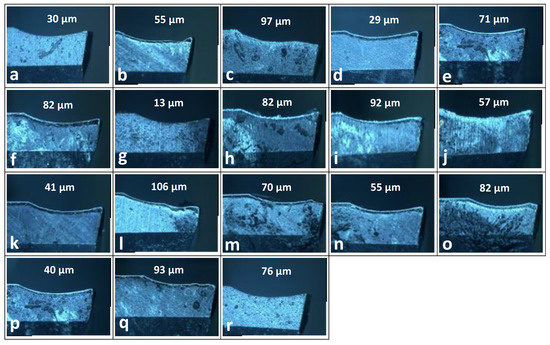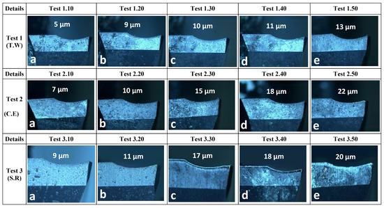 Peripheral cutting-edge wear is higher for Experiments 3 (eccentricity = 1 mm, spindle speed for CFRP and Ti = 6500 rpm and 1500 rpm respectively, axial pitch = 2.0 mm, tangential feed = 0.03 mm/tooth, concertation of nanoparticles in MQL solution = 1%), 8 (eccentricity = 1 mm, spindle speed for CFRP and Ti = 7500 rpm and 1250 rpm respectively, axial pitch = 2.0 mm, tangential feed = 0.02 mm/tooth, concertation of nanoparticles in MQL solution = 0.5%) and 12 (eccentricity = 2 mm, spindle speed for CFRP and Ti = 6500 rpm and 1500 rpm respectively, axial pitch = 1.5 mm, tangential feed = 0.02 mm/tooth, concertation of nanoparticles in MQL solution = 0.5%). Larger values of axial pitches (2 mm and 1.5 mm) are the reasons, which are also validated by the length of peripheral wear by measurement on a CMM. Maximum flank wear is recorded for experiment 12, which is directly correlated with temperature rise and also the average burr height value of titanium. The flank wear micrographs are shown in Figure 14 at different processing conditions.