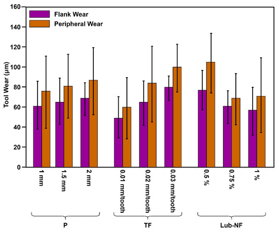 The flank wears ~17% with eccentricity changing from 1 to 2 (Figure 13). However, there is no significant change in tool wear with the increase in spindle speed (from 6500 to 7500 rpm) in the case of CFRP. On the other hand, at a lower spindle speed of 1000 rpm, the flank wear is around 40 µm, which increases linearly by 90 µm by increasing speed up to 1500 rpm (125% increase). Similar increasing trends are observed for pitch and tangential feed. However, the flank wear substantially decreased as the concentration of MoS2 increased. The nano fluids influence cutting temperature, which minimises wear growth and results in longer tool life [25].