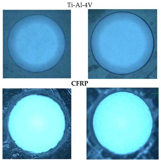 Experimental images of the hole qualities achieved at Ti-6Al-4V and CFRP layers are shown in Figure 17. The displayed holes are 10 mm in diameter with a 2 mm eccentricity.