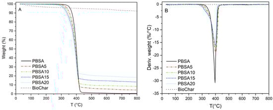 The PBSA thermogram shows thermal stability up to about 300 °C with a single sharp stage of thermal degradation resulting in a peak close to 400 °C. A negligible residue (0.4 wt.%) was measured at 800 °C.