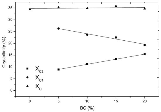 The degree of crystallinity (XC) of PBSA and PBSA/BC composites determined by Equation (1) remains almost constant with the increase in BC content (from 34.4 to 35.8%, Table 2 and Figure 3). These crystallinity values align with those reported in similar studies using the same type of PBSA [13,34]. Although the addition of BC did not affect the total crystallinity XC, this value is calculated as a sum of two endothermic peaks: a small shoulder peak at about 76–78 °C (Tm2), followed by a large peak at about 87–88 °C (Tm1). The shoulder peak is not present in the pure PBSA and only appears in the PBSA composites. PBSA/BC composites maintain the same level of total crystallinity (XC) equal to the pure polymer; however, the proportion of crystallinity estimated by the areas under the peaks associated with the two endothermic events changes slightly with BC concentration; in particular, the higher the BC content, the greater is the crystallinity associated with the shoulder peak (XC2), and, in turn, the smaller the crystallinity associated with the large peak (XC1).
