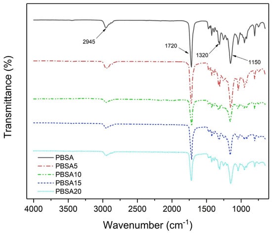 The FTIR spectra of PBSA and PBSA/BC composites reported in Figure 4 confirm the non-specific molecular interactions between PBSA and biochar. The spectrum of the virgin PBSA matches with the PBSA/BC composites spectra and no relevant chemical shift and/or appearance of other bands associated with filler-matrix bonds are observed comparing the various spectra. It is important to note that biochar is a carbon-based compound with no relevant FTIR absorption bands displayed in the 4000–650 cm−1 wavenumber range. In light of this, the peaks at 1320 cm−1 and 2945 cm−1 were attributed, respectively, to the symmetric and asymmetric vibrations of CH2 groups in the PBSA main chains. The primary band at 1720 cm−1 was ascribed to the C = O stretching vibrations of PBSA ester groups, while the band at 1150 cm−1 was caused by the stretching of the -C-O-C- group in the ester linkages of PBSA [41]. In conclusion, biochar acts as pure filler damping the electromagnetic IR signal. As a result, the various PBSA peaks result in less sharpness as biochar content increases.