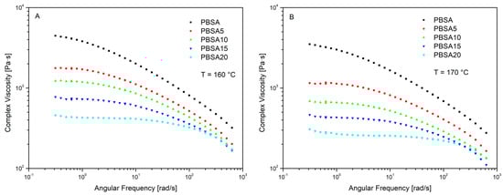 Complex viscosity versus angular frequency of PBSA and PBSA/BC composites at 160 °C (A) and 170 °C (B).
