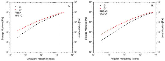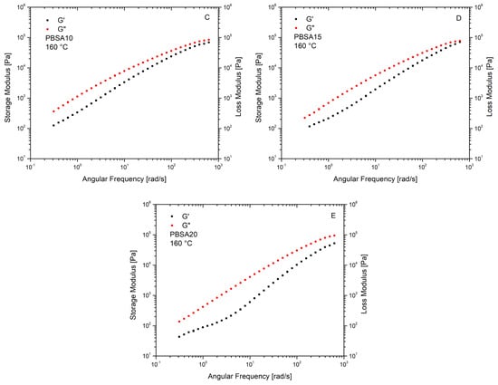 Storage G′ (■) and Loss G″ (•) moduli vs. frequency of PBSA and PBSA/BC composites at 160 °C. PBSA (A), PBSA5 (B), PBSA10 (C), PBSA15 (D), PBSA20 (E).