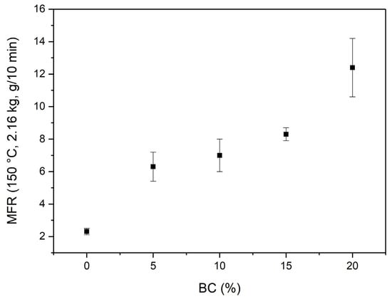 MFR at 150 °C for neat PBSA and PBSA/BC composites. Mean values ± standard deviations of 3 replicates.