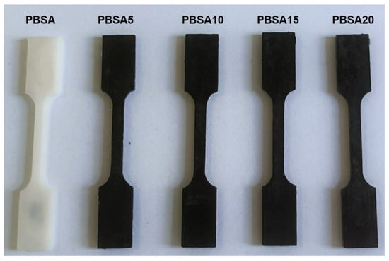 Dog-bone specimens of PBSA and PBSA/BC composites for tensile tests.