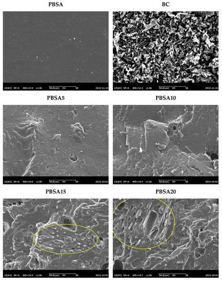 Figure 9 reports the SEM images of the freeze-fractured transversal sections of PBSA and PBSA/BC composites. The PBSA polymer surface appears compact and smooth without voids or fractures. Biochar particles have the typical morphology of a pyrolyzed milled lignocellulose particulate with an irregular flat-shaped structure. Their size was estimated via ImageJ software within the 5–60 µm range. Biochar particles are uniformly dispersed in the polymer matrices if their content remains below 10 wt.% (PBSA5 and PBSA10), whereas they form agglomerates at higher concentrations (PBSA15 and PBSA20) that are visible as oriented particle streaks on the fractured pellet surfaces. These agglomerates are the particle-to-particle networks previously discussed that may be responsible for the loss of elastic property at high biochar content, hence making the material more fragile. The various composites present some voids and cracks that could be caused by the slow biochar degradation that occurred during processing and dog-bone preparation. This level of microporosity, which is not present in the neat PBSA, could be also caused by the simple filler-matrix mechanical debonding occurring at the pellet surface during cryogenic surface fracturing.