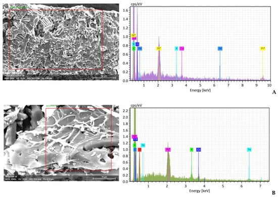 EDS microanalysis of specific areas on PBSA20 (A) and Biochar (B). The platinum Pt peak is associated with the sample surface coating.