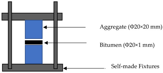 In order to quantitatively measure the adhesion of the asphalt mastic–aggregate interface, the asphalt mastic–aggregate interface specimens were prepared as shown in Figure 2. The mechanical failure tests were conducted by controlling the asphalt mastic thickness within 1 mm. The sample preparation processes included the following: (1) Installing a mold with the aggregates; (2) aligning the cylindrical aggregates (Φ20 × 20 mm) in self-made fixtures; (3) loading the asphalt mastic in between two pieces of aggregates; (4) controlling the thickness of the asphalt mastic within 1 mm; (5) demolding the asphalt–aggregate interface specimen; (6) removing the extra asphalt mastic around the interface. Then, the bond strength of the interface was tested using a testing machine. In this study, a 1 mm spacer was used to control the thickness of the asphalt mastic, and three types of mastics and three aggregates were used to prepare nine groups of asphalt mastic–aggregate interface specimens. The specific specimen designs and names are shown in Table 6.