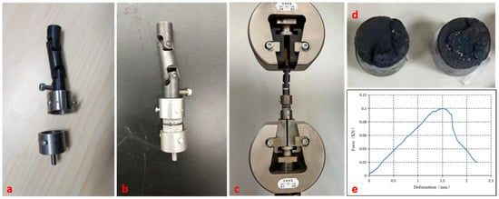 Testing of asphalt mastic–aggregate interface specimens: (a) holding fixture; (b) specimen fixed by holding fixture; (c) specimen fixed into universal testing machine; (d) specimen failure surface; (e) loading curve.