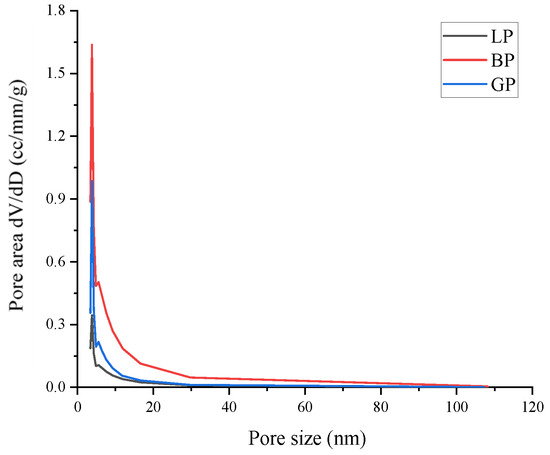 The Brunauer–Emmett–Teller (BET) method was applied to calculate the specific surface area of the fillers according to nitrogen adsorption isotherm measurements. Using the Barrett–Joyner–Halenda (BJH) model, the pore size distributions of the fillers were derived from the adsorption branches of the isotherms. The pore volume distributions of the mineral fillers as assessed by physical adsorption under high vacuum conditions (measured using Micromeritics ASAP2020 PLUS) are shown in Figure 4. The pore size distribution ranges of LP and GP were roughly similar, ranging from 4 to 20 nm, while the pore size distribution of BP was relatively wider, ranging from 4 to 40 nm. The BJH pore volume, the average pore size, and BET specific surface area of the fillers are listed in Table 7. It can be observed that the pore volumes of LP and GP were 0.007 cm3/g and 0.009 cm3/g, respectively, which were obviously lower than that of BP with 0.034 cm3/g. The average pore sizes of BP and GP were similar, i.e., 3.810 nm and 3.819 nm, respectively, and the average pore size of LP was slightly smaller at 3.059 nm. According to the specific surface area calculated by BET, it can be seen that the specific surface area of LP was the smallest (1.899 m2/g), while the specific surface area of BP was the largest (9.008 m2/g). Moreover, the specific surface area of GP (3.42 m2/g) was between LP and BP. As previously reported, the differences in the pore volume and specific surface area of the mineral powders certainly affect the selective absorption of the asphalt component according to the filler, and then affect the performance of the asphalt mastic and mixture [27].