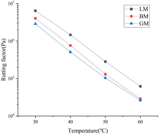 The rutting factor G*/sinδ, which is commonly used in the Superpave specification, characterizes the long-term deformation ability of asphalt mastic, with a high value indicating a high ability to permanently deform. Figure 7 shows the rutting factors of the different types of asphalt mastics. At the same temperature, the order of the rutting factor was LM, BM, and GM, which was related to the particle size, pore volume, and surface area. The particle size of LP was the smallest, which made it more dispersed in bitumen, so LM had better resistance to permanent deformation. The specific surface area and pore volume of BP were three times those of the granite mineral powder, so that the permanent deformation resistance of BM was higher than that of GM.