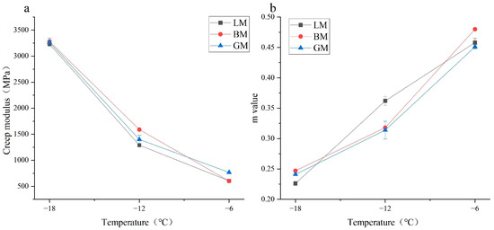 The creep stiffness modulus S as assessed using the BBR characterizes the low-temperature performance of asphalt mastics. The higher the S value, the worse the low-temperature cracking resistance of the mastic. The creep rate m characterizes the change rate of the stiffness of the mastic with time, with high values indicating low deformation [29]. The results of the stiffness modulus S and m values of asphalt mastics are shown in Figure 8. It can be seen that the S of the three asphalt mastics decreased with the increase in the temperature, and the m increased with the increase in the temperature. This shows that, with the decrease in the temperature, the low-temperature cracking resistance of the three asphalt mastics reduced. The S and m values of the three mastics were not obviously different, indicating that the type of mineral filler had relatively less effect on the low-temperature performance of asphalt mastics. BP had the largest specific surface area, and it was shown to adsorb more light bitumen components. When the content of structural components increased, it resulted in the highest S value for BM at −18 °C and −12 °C. The slope m-value was introduced. A low slope value indicates a lower capacity to endure the stresses produced at low temperatures. In Figure 8b, BM at different temperatures (−6, −12, and −18) did not follow the same trend as LM and BM. This might be because of porous physical features of BP resulting in a different low-temperature resistance. The S value of LM was relatively low, the m value was high, and the cracking resistance was good, which was also related to its small specific surface area and pore volume.