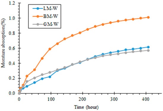 In order to study the diffusion characteristics of water in asphalt mastics subjected to normal temperature and pressure, the moisture absorption curves of asphalt mastics under different immersion times were obtained using a gravimetric method. The results are shown in Figure 9. With the prolongation of the immersion time, water continuously diffused into the asphalt mastics and gradually became saturated. After soaking for 384 h, the change in the moisture absorption rate of the asphalt mastic tended to be gentle and essentially reached saturation. When exposed to the condition of water immersion, the moisture absorption rate of BM was the highest, followed by LM and GM. This could be related to the pore features of BP, i.e., a high pore volume and surface area.