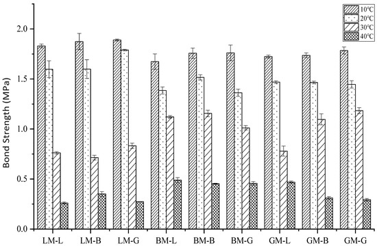 The bond strength results of the asphalt mastic–aggregate interfaces at different temperatures are shown in Figure 10. At 10 °C and 20 °C, the LM–L, LM–B, and LM–G interfaces had the highest bond strengths, compared to the other interfaces. For 30 °C and 40 °C, the BM–L, BM–B, and BM–G interfaces had the highest bond strengths. This shows that the interface bond strengths of the asphalt mastics were strongly determined by temperature and the mastic type. When increasing the temperature, the interface strength decreased gradually. The effect of temperature on the interface bond strength of the interfaces exhibited similar trends. Under 20 °C, the bond strength of the three interface combinations using LM was greater than that of BM and GM.