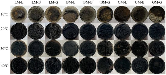 Fracture interfaces are illustrated in Figure 11. The failure modes of the asphalt mortar–aggregate interface were divided into two types: cohesion failure inside the asphalt mastic and adhesion failure at the asphalt mastic–aggregate interface. Under 20 °C, the failure mode was mainly the cohesion failure of the asphalt mastic–aggregate interface, indicating that the LM–aggregate interface had the best adhesion in the dry state and at a relatively low temperature. With the increase in temperature, the failure mode gradually changed from cohesion failure to adhesion failure. The bond strength of the specimen was mainly dominated by the adhesive strength of the asphalt mastic. The bond strength of the specimen prepared using BM was the highest, indicating that the adhesive strength of the BM system was higher, which was related to the larger pore volume, specific surface area, and surface morphology of BP. Moreover, the structural component of bitumen in the asphalt mastic can produce good adhesion with coarse aggregates.