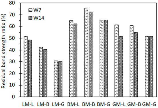 Residual bond strength ratios of asphalt mortar–aggregate interfaces under 7-day and 14-day water immersion.