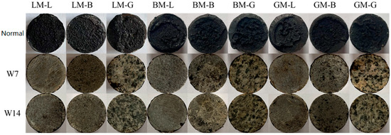 Figure 12 shows the residual bond strength ratios of asphalt mastic–aggregate interfaces under immersion in water for 7 days (W7) and 14 days (W14) without pressure. The residual bond strength was defined as the ratio between the bond strength before water immersion and after water exposure. It can be seen that when subjected to water immersion, all interfacial bond strengths decreased. This also gradually decreased with the extension of the immersion period from 7 days to 14 days. For the same immersion period, the residual bond strength ratios of BM–L, BM–B, and BM–G were between 62% and 76%, which were higher than those of the other mastic–aggregate interfaces. This may be attributed to the higher content of structural asphalt in BM, and the larger pore volume of basalt helps to produce stable mechanical interlocking with asphalt, while the difference in the diffusion coefficient between the aggregate and asphalt does not play a dominant role. For the same asphalt mastic, the mastic–granite aggregate interfaces had relatively lower residual bond strength ratios compared to other two types of aggregates. This is because the interface formed by the weakly acidic mineral components of the granite aggregate and the asphalt mastic peels off easily when exposed to water, resulting in a rapid attenuation of its strength. Moreover, it was noticed that after water immersion, the residual bond strength ratios of the LM–aggregate interfaces were lowest, indicating that the water attack was more serous in the LM–aggregate interfaces. The specimens prepared from LM did not obtain the ideal residual bond strength ratios, which may be affected by two factors: (1) The specimens prepared from LM (LM–L, LM–B, and LM–G) were in a dry state. Their bond strengths were the highest, resulting in the highest initial bond strength values; (2) the small pore volume and specific surface area of LP result in the mechanical interlocking with asphalt being weak, and thus, it can be eroded by water. Figure 13 shows the failure images of each asphalt mastic–aggregate interface when subjected to water immersion. It can be seen that the interface was completely damaged via adhesion failure, indicating that after immersion in water for 7 d and 14 d, the water can reach the asphalt mastic–aggregate interface and the interface is adhesively damaged.