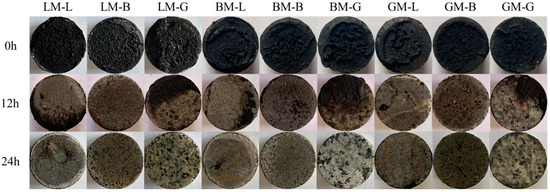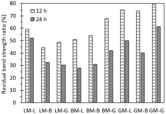 Figure 14 shows the residual bond strength ratios of the asphalt mastic–aggregate interfaces subjected to a water pressure of 0.5 MPa for 12 h and 24 h. It can be seen that with the prolongation of the water pressure action time, the residual bond strength ratio of each type of interface gradually decreased. For comparison, the residual bond strength of the GM–aggregate interfaces (GM–L, GM–B, and GM–G) was the highest, which may be due to the dominant effect of the low diffusion coefficient of GM under the action of water pressure. Figure 15 shows the interface failure images of each interface after water pressure for different times. It can be seen that, in the absence of water pressure (0 h), interface cohesion failure occurred. When water reached to the bonding interface with pressure (12 h and 24 h), interface failure developed from cohesion failure to adhesion failure.